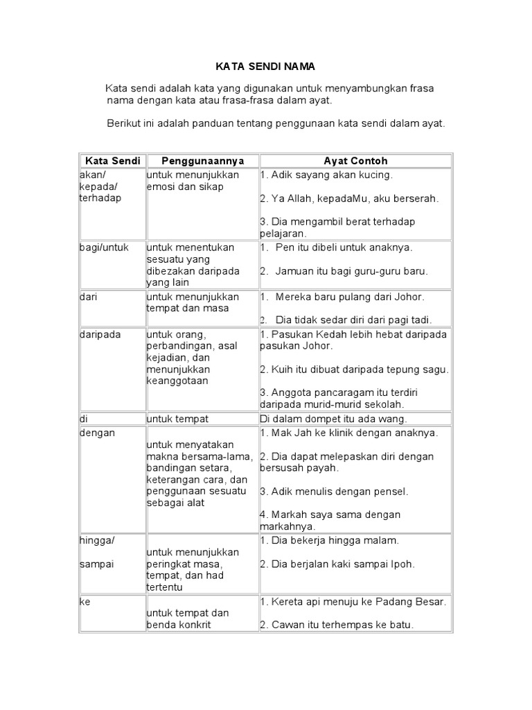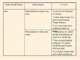 Kata benda atau nomina adalah kelas kata yang menyatakan segala sesuatu yang dapat dibendakan. Biasanya kata sendi akan contoh soal dan materi pelajaran 8 contoh kata sendi nama. Learn vocabulary, terms and more with flashcards, games and other study tools. Frasa sendi nama juga boleh didahului oleh kata bantu sama ada kata bantu ragam atau kata bantu aspek. Fs sebagai predikat ayat 1. Ke dalam tong sampah 3. Let me introduce myself first. Tidak boleh digunakan oleh manusia, asal sesuatu atau perbandingan. Contextual translation of contoh ayat kata sendi nama into english. Menerangkan tentang tempat atau arah. Kata sendi nama ialah perkataan yang letaknya di hadapan frasa nama. Kata kerja adalah kelas kata yang menyatakan tindakan yang dilakukan oleh subjek. Menunjukkan bahagian yang ditentukan atau diperuntukkan.