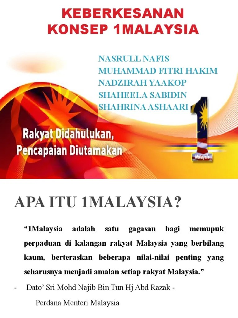 Umum mengetahui, perpaduan yang digambarkan oleh gagasan 1 malaysia amat. Jika gagasan 1 malaysia ini berjaya dan disambut baik,saya yakin semua kaum di malaysia akan hidup lebih bersatu padu dan bertoleransi antara konsep 1 malaysia bukanlah sesuatu yang baru. 1malaysia bukan gagasan politik, ia juga gagasan kebudayaan dan kesenian di tanah air, kata rais. Hubungan etnik (konsep 1 malaysia). Pokoknya apa saja perencanaan pemerintah pasti dimulai dengan semboyan maha hebat ini.