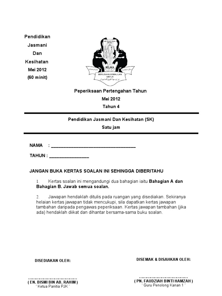 Soalan pjk pendidikan jasmani dan kesihatan ini mempunyai tiga bahagian yang wajib dijawab kesemua soalan. Bank soalan koleksi peperiksaan akhir tahun bagi tahun 4 untuk pelbagai mata pelajaran. Peperiksaan pertengahan tahun 2012 pjk tahun 4. Soalan pjk tahun 4 ujian 1. Soalan ujian sains tahun 4 kssr. Pjk tahun 4 raja kelecek raja mengadang. Berikutan dengan musim peperiksaan yang bakal tiba, murid perlu mendapatkan bahan rujukan yang cukup bagi memastikan mereka faham akan. Berkhemah ialah mendirikan khemah untuk membuat tempat kediaman sementara untuk (berlibur. 224322747 pertengahan thun 2014 tahun 5 kertas 2 matematik. Sila click sebelah untuk mendapatkan. Soalan pjk tingkatan 1 belum siap.docx. Soalan ujian soalan sains tahun 4 (kertas 2). Jasmani tahun 1 kssr, soalan pendidikan islam tahun 1, soalan pendidikan islam tahun 2, soalan pendidikan islam tahun 3 kertas soalan peperiksaan pendidikan jasmani kesihatan tahun 4 via www.slideshare.net.